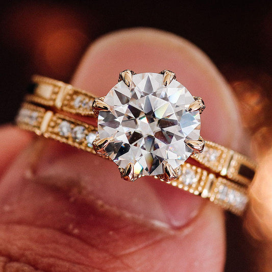 Round Cut Lab Diamond Ring, Moissanite Vintage Style Milgrain Ring Set