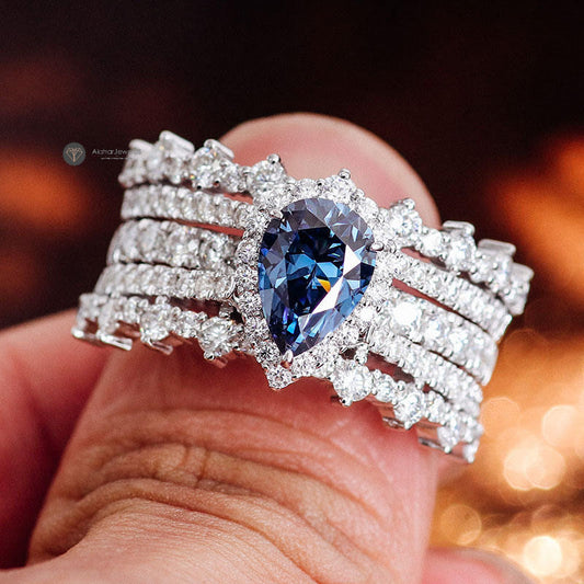 Fancy Blue Pear Moissanite Halo Engagement Ring Set