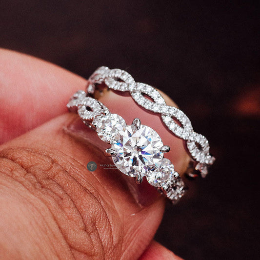 Round Moissanite Three Stone Pave Set Ring Set