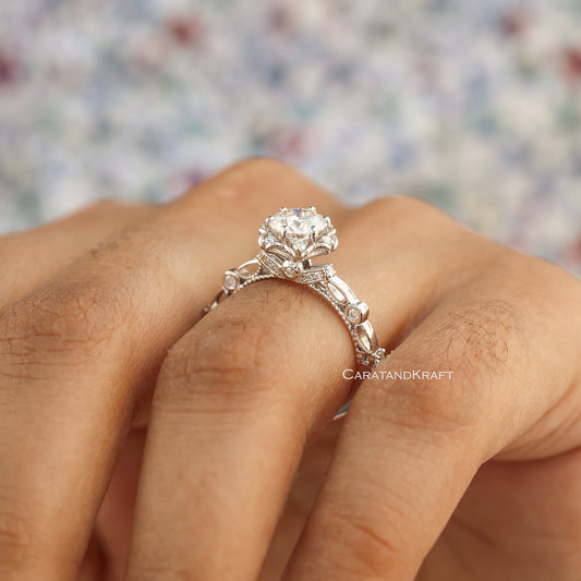 1.00 CT Round Cut Moissanite Engagement Ring, Antique Vintage Style Flower Halo Ring