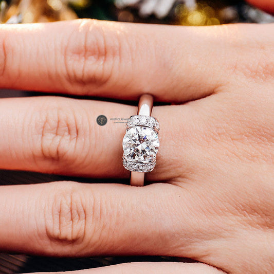 6.50mm Round Half Bezel Set Lab Grown Diamond Unique Halo Moissanite Ring