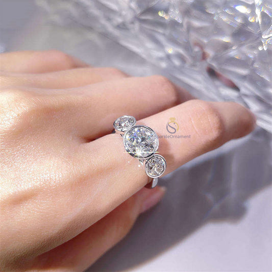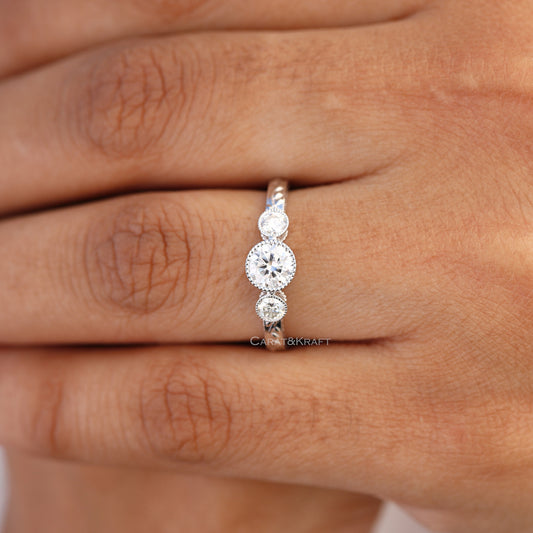 Three Stone Lab Grown Diamond Ring, Bezel Set Vintage Ring