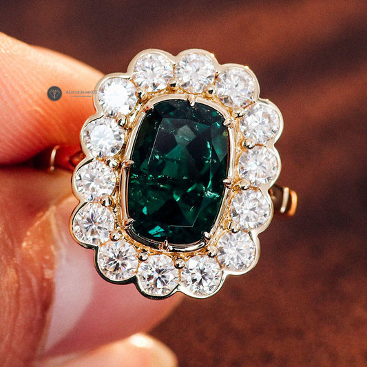 1.0CT to 5.0CT Green Emerald Elongated Cushion Cut Cluster Halo Ring